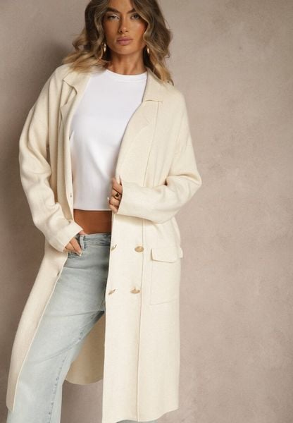 Jasnobeżowy Rozpinany Elegancki Kardigan z Wiskozą Ozdobiony Guzikami Arovira
