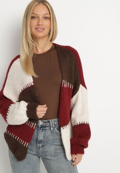 Bordowy Kardigan z Wełną i Wiskozą w Patchworkowe Łaty Fesunesa