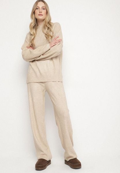 Jasnobeżowy Dzianinowy Komplet z Wełną Spodnie i Sweter Tesira
