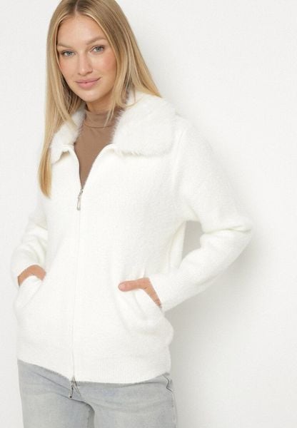 Jasnobeżowy Kardigan z Wełną z Futrzanym Kołnierzem Zapinany na Suwak Sistte