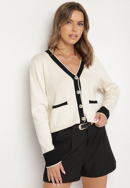 Beżowy Kardigan z Wiskozą z Ozdobną Lamówką i Guzikami Halirena