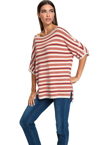 – dekolt: okrągły- krój rękawów: nietoperz- długość rękawa: 3/4- dolny brzeg: z rozcięciem- detale: ozdobne guziki- krój: oversized- wzór: paski