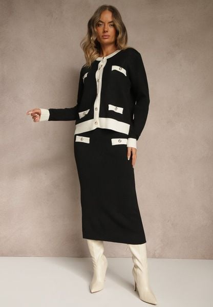 Czarno-Biały Sweterkowy Komplet z Dzianiny z Bawełną Kardigan i Spódnica Derrive