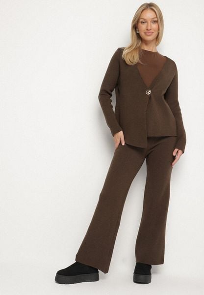 Brązowy Komplet Dzianinowy z Wiskozą Asymetryczny Kardigan i Spodnie Unallea