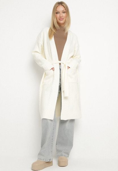 Jasnobeżowy Niezapinany Kardigan z Wełną z Warkoczowym Splotem i Wiązanym Paskiem Darrive