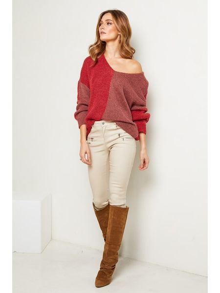 – z dodatkiem wełny- dekolt: V- ściągacz: zakończenia rękawów, dolny brzeg- wzór splotu: luźny- krój: luźny- wzór: colour blocking