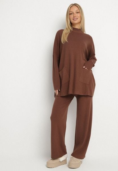 Brązowy Komplet Dzianinowy z Wiskozą Długi Sweter i Szerokie Spodnie Oleissa