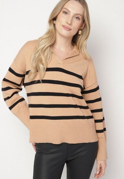 Beżowo-Czarny Sweter Ozdobiony Paskami i Kołnierzykiem Arsena
