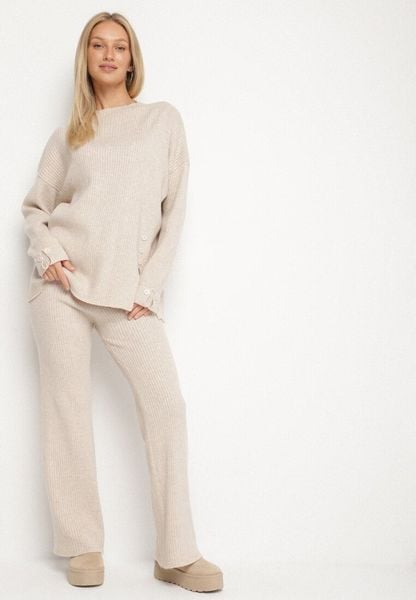 Jasnobeżowy Komplet Dzianinowy z Wełną i Bawełną Sweter z Guzikami i Spodnie Lanadia