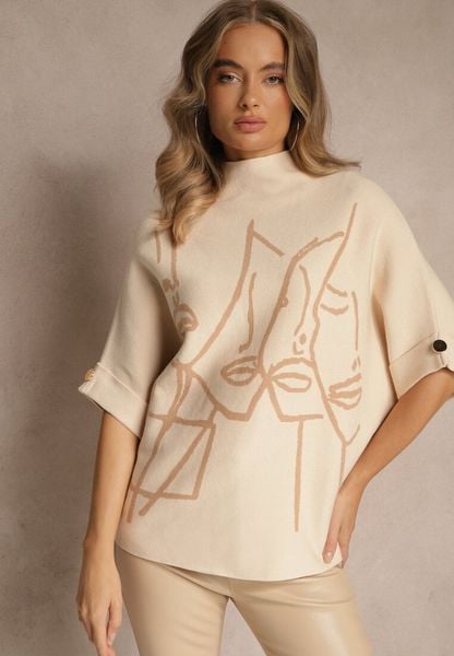 Beżowy Golf o Pudełkowym Kroju z Krótkim Rękawem Zdobiony Grafiką Uninasea
