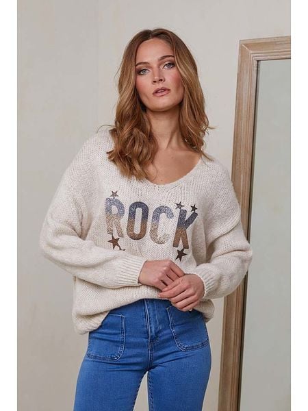 – dekolt: V- wzór splotu: luźny- krój: luźny- nadruk: w formie napisu- look: jednokolorowy