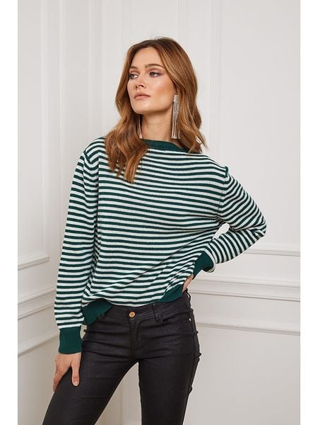 – z dodatkiem kaszmiru- dekolt: łódka- ściągacz: zakończenia rękawów, dolny brzeg- krój: luźny- wzór: paski