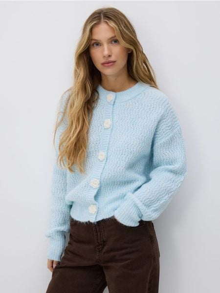 Kardigan o prostym kroju, wykonany z dzianiny z dodatkiem wełny.