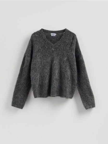 Sweter o swobodnym kroju, wykonany z dzianiny z wełną i moherem.