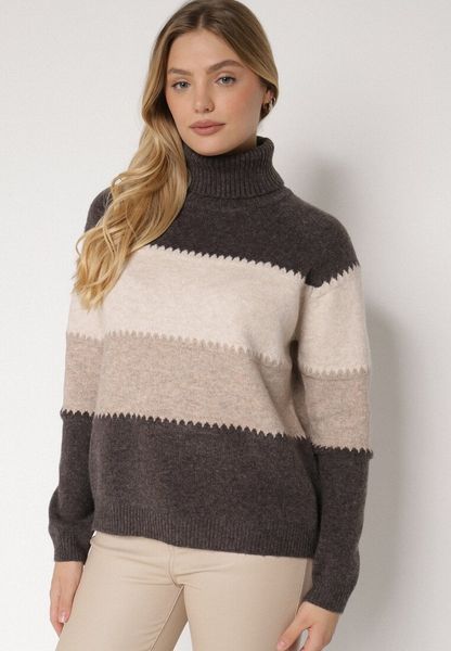 Brązowy Golf Oversize w Szerokie Pasy z Domieszką Kaszmiru Nellemia