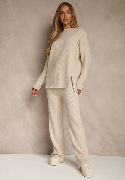 Jasnobeżowy Komplet z Wełną i Bawełną Sweter z Guzikami i Szerokie Spodnie Reinelia