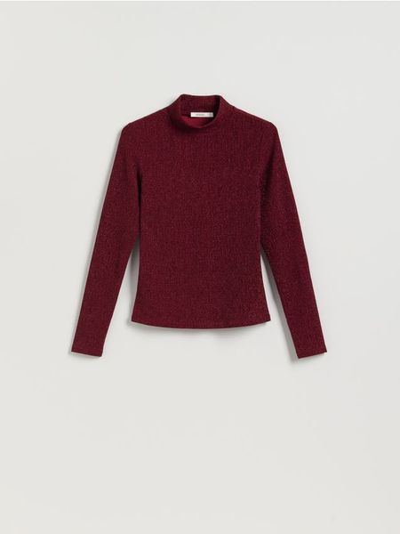 Golf o prostym kroju, wykonany z dzianiny z dodatkiem metalizowanej nici.