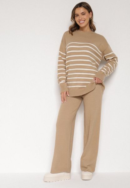 Ciemnobeżowy Komplet z Wełną i Bawełną Sweter w Paski i Szerokie Spodnie Neveena