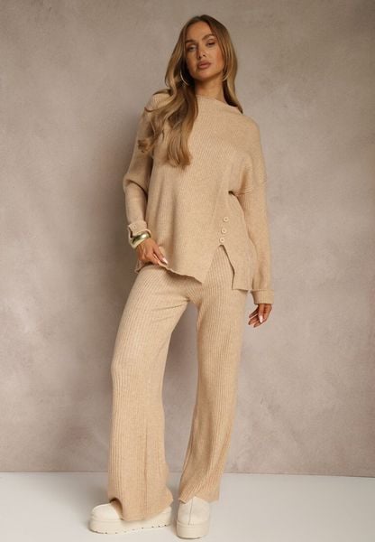 Beżowy Komplet z Wełną i Bawełną Sweter z Guzikami i Szerokie Spodnie Reinelia
