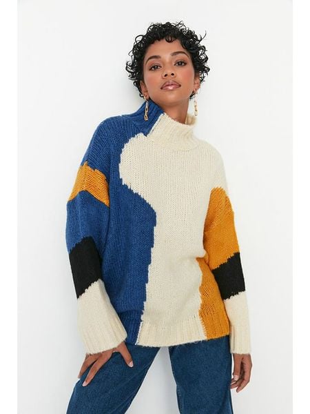 – kołnierz: golf- krój: luźny- wzór splotu: ścisły- wzór: graficzny