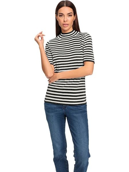 – kołnierz: stójka- długość rękawa: 1/3- detale: połyskująca nitka- krój: prosty- wzór: paski