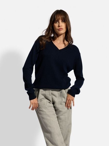 – czysty kaszmir- dekolt: V- ściągacz: dekolt, zakończenia rękawów, dolny brzeg- krój: prosty- look: jednokolorowyUwaga: Zaniżona rozmiarówka – ten produkt zalecamy zamawiać w rozmiarze o jeden numer większym niż zwykle.