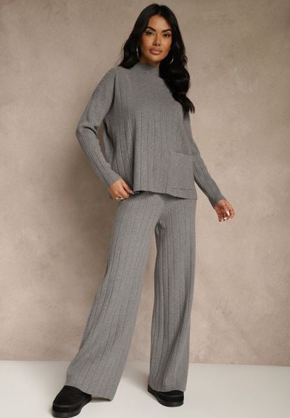 Szary Komplet Dzianinowy Spodnie o Szerokim Kroju i Sweter Półgolf Datusa