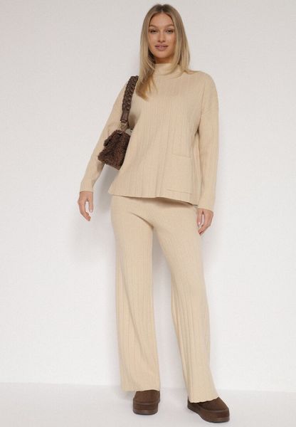 Beżowy Sweterkowy Komplet Sweter z Półgolfem i Szerokie Spodnie Alatusa