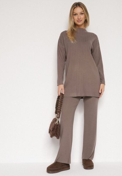 Ciemnobeżowy Prążkowany Komplet Dzianinowy z Bawełną Sweter z Półgolfem i Spodnie Elweda
