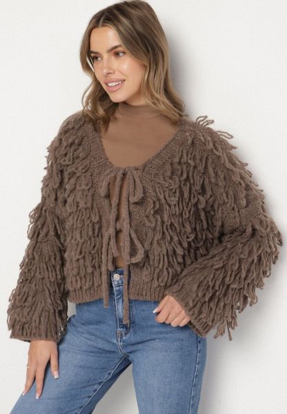 Jasnobrązowy Wiązany Kardigan z Dodatkiem Wełny i Wiskozy Zdobiony Frędzlami Tiravea