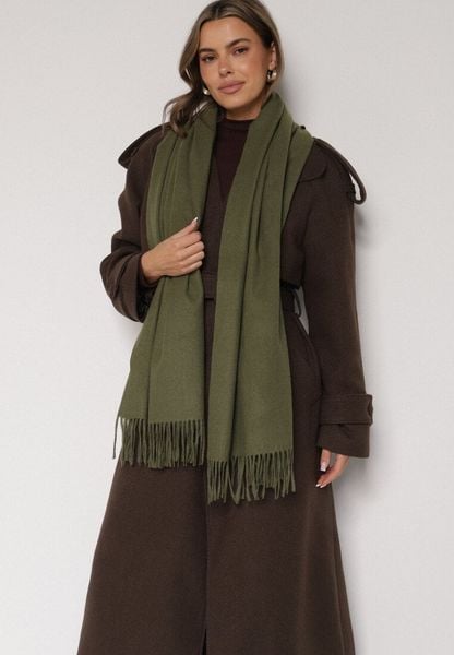 Ciemnozielony Szalik z Bawełną i Wiskozą Ozdobiony Frędzlami Siadortia