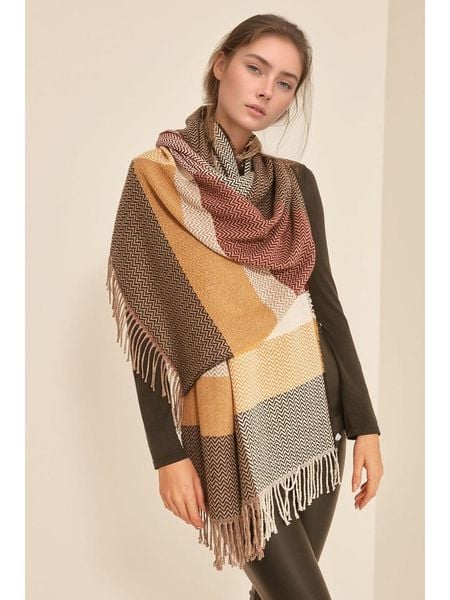 – ogrzewający i delikatny dla skóry materiał- frędzelki: długie- wzór: colour blocking