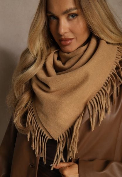 Jasnobrązowy Bawełniano-Wiskozowy Szalik w Kształcie Trójkąta z Frędzlami Vetisara