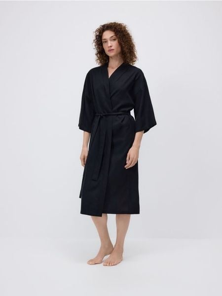 Szlafrok o swobodnym kroju, wykonany z lyocellu i lnu.