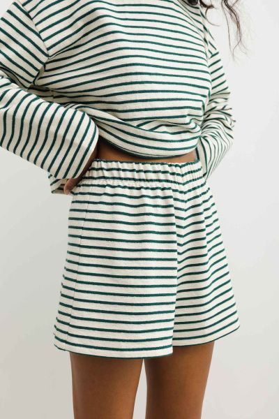 Szorty z bawełny strukturalnej w zielono beżowe paski – PENNY-L