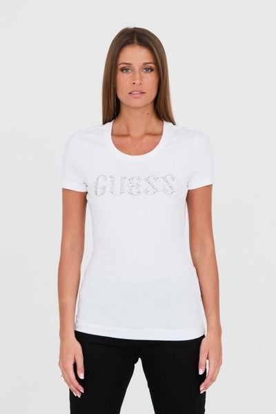 GUESS Biały damski t-shirt bawełniany Stones Logo Tee, Rozmiar L
