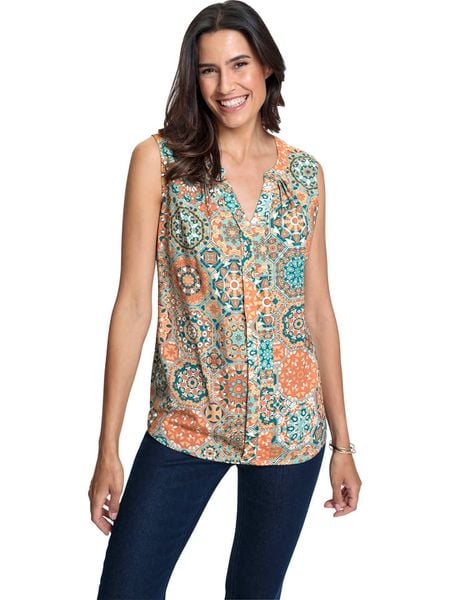 – czysta wiskoza- kołnierz: stójka- dekolt: V- ramiączka: szerokie- krój: prosty- dolny brzeg: zaokrąglony- wzór: na całości