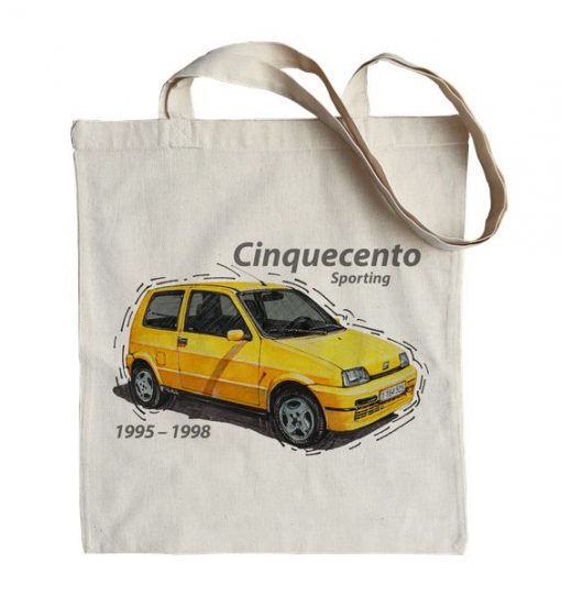 Bawełniana torba na ramię z samochodem Cinquecentowymiary: 38 x 42 cm, długość uchwytu: 2,5 x 70 cmgramatura: 220gmateriał: bawełna 100%kolor: ecruFiat CinquecentoFiat Cinquecento, co po włosku oznacza „pięćset”, miał zastąpić na rynku aut segmentu A popularnego „Malucha” – Fiata 126. Miejscem produkcji nowego modelu od samego początku do jej zakończenia były Tychy.Autorem rysunku jest Mariusz […]