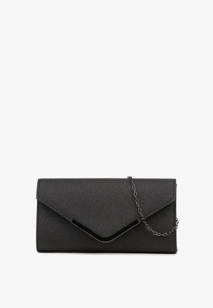 Czarna Brokatowa Torebka Kopertówka z Łańcuszkiem i Metaliczną Aplikacją Pasliniela