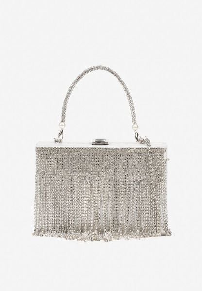Srebrna Wieczorowa Torebka z Rączką Wykończona Cyrkoniami i Łańcuszkiem Fenagia