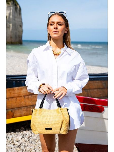 – materiał: słoma, skóra- powierzchnia: pleciona- krótki pasek na ramię: 2- długi pasek przez ramię: odpinany- zapięcie: suwak- kieszenie zewnętrzne: tak, na zamek- kieszenie wewnętrzne: 1 kieszeń na zamek- tekstylna podszewka: tak