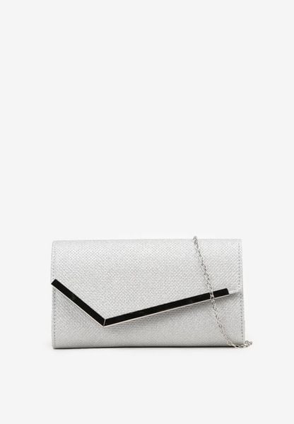 Srebrna Metaliczna Torebka Kopertówka z Łańcuszkiem i Asymetryczną Klapą Floreve