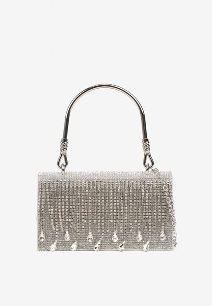 Srebrna Wieczorowa Torebka z Rączką Wykończona Cyrkoniami i Łańcuszkiem Fenagia