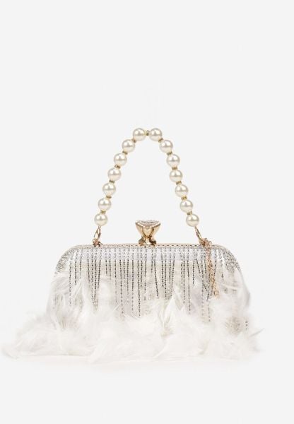 Srebrna Torebka Kopertówka Vices z Łańcuszkiem Zdobiona Piórami i Perłami Fessoria