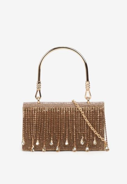 Złota Wieczorowa Torebka z Rączką Wykończona Cyrkoniami i Łańcuszkiem Fenagia