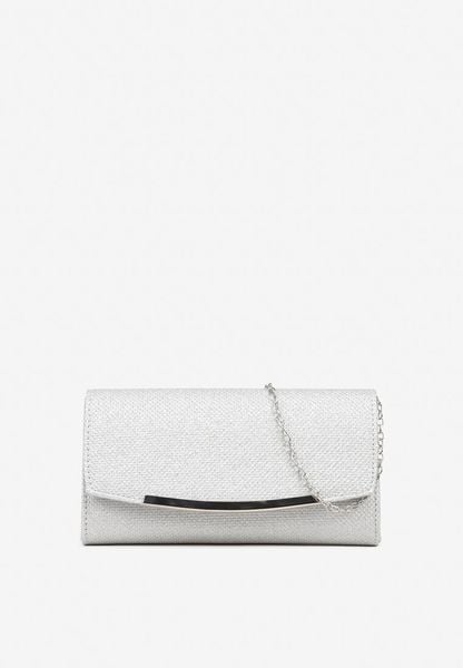 Srebrna Brokatowa Torebka Kopertówka z Ozdobnym Zatrzaskiem i Łańcuszkiem Ridia