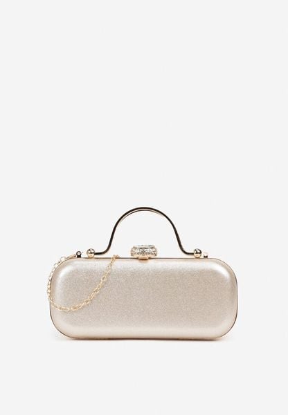 Złota Wieczorowa Torebka z Rączką Wykończona Cyrkoniami i Łańcuszkiem Fenagia