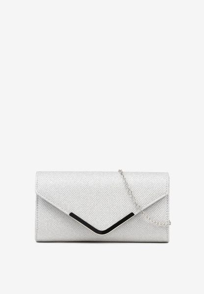 Srebrna Torebka Kopertówka z Łańcuszkiem Zdobiona Metaliczną Aplikacją Idalinna
