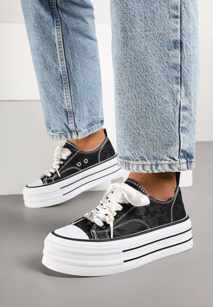 Czarne Trampki na Grubej Podeszwie z Perełkami Korami