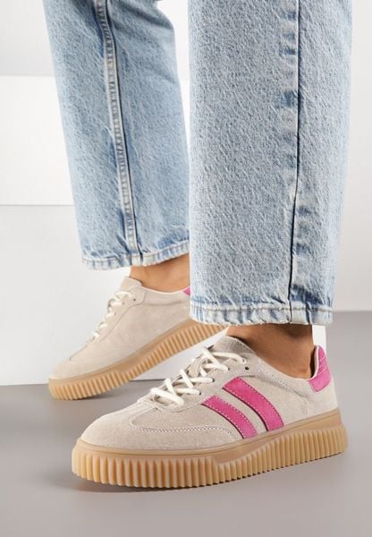 Beżowo-Fuksjowe Zamszowe Sneakersy Typu Tenisówki ze Skórzaną Wkładką Ozdobione Paskami Melissele